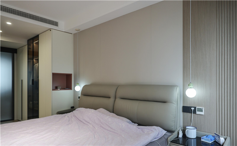 區(qū)別于客廳的四面落白,臥室整墻木飾面中和了空間結(jié)構(gòu)帶來(lái)的冷硬感,自然質(zhì)感與柔和燈光的和諧共鳴,喚起生活的溫情。