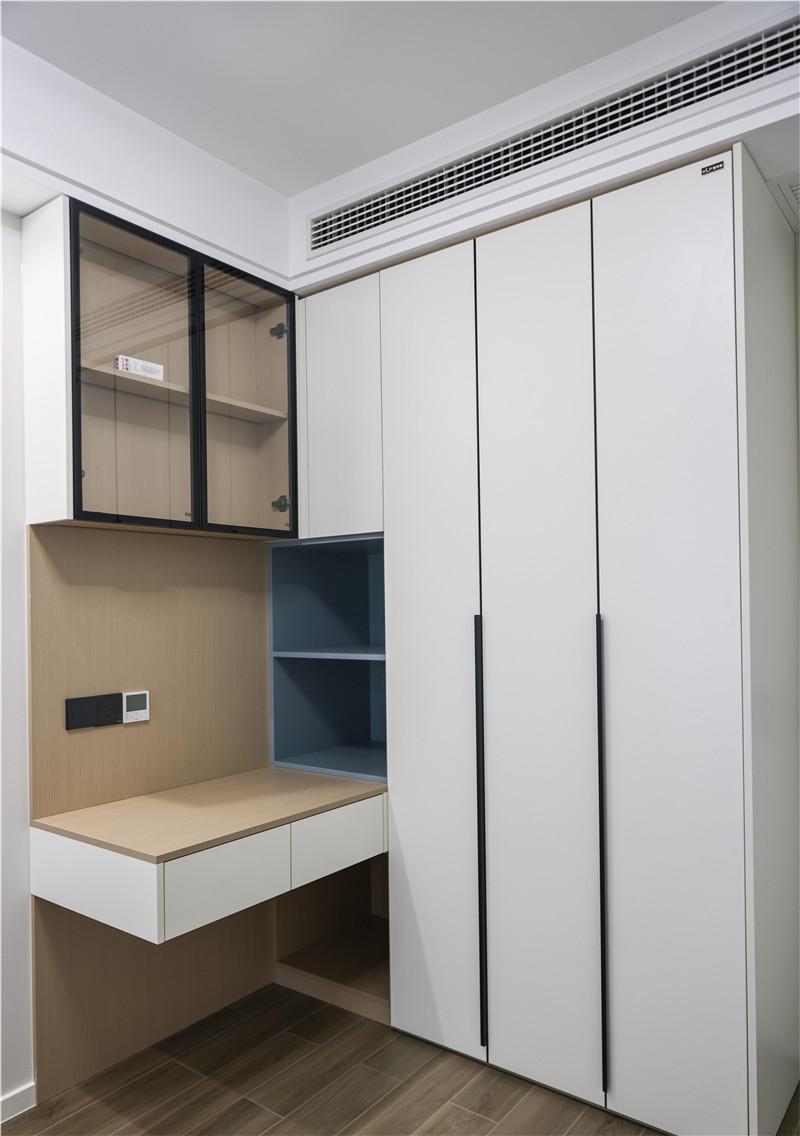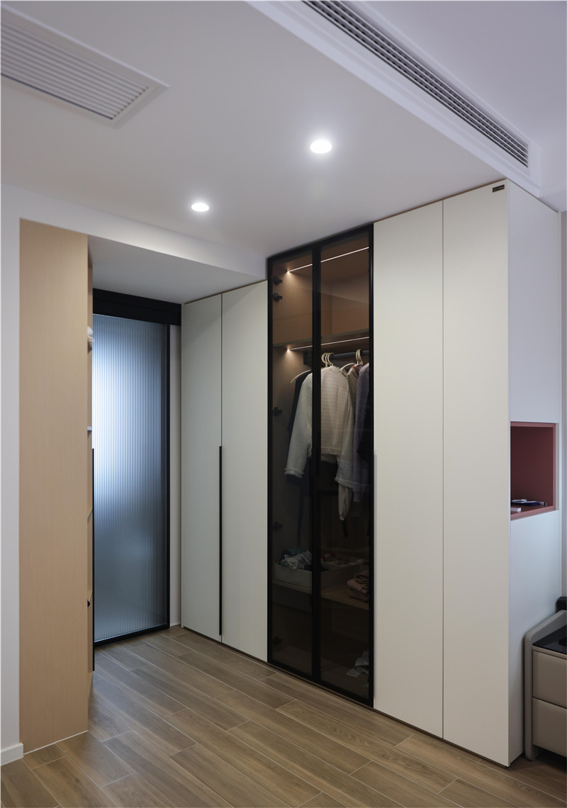 頂天立地式衣柜,藏露相間,拿捏陳列精髓,利落線條,加強(qiáng)縱線延伸感。封閉柜搭配玻璃展示柜和跳色開放格,從容展現(xiàn)了收納空間的多面利用。