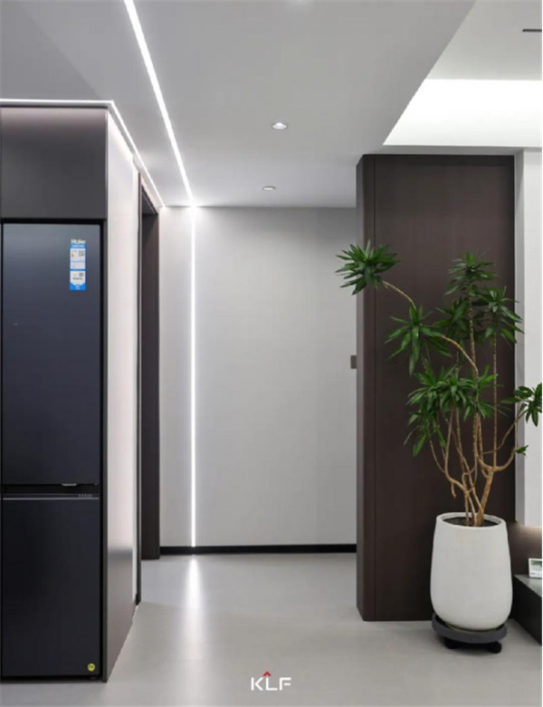 餐廳成開放式狀態(tài),寬廣的臺面和餐椅展露空間的社交屬性,滿足親朋好友的聚餐品酒,櫥柜采用烤漆板,冰箱巧妙嵌入廚房,將精致和觸感演繹。