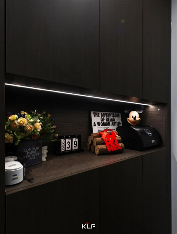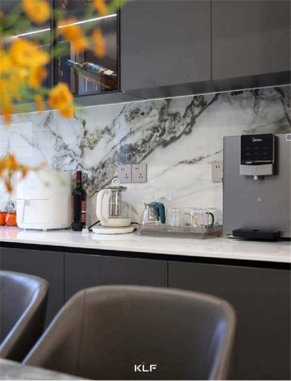 想要做到空間留白與有序收納的平衡,開放式的開放柜與深灰色色彩碰撞,形成不同而合的視觸覺體驗(yàn),意式極簡風(fēng)之下,空間氛圍更顯寬敞。