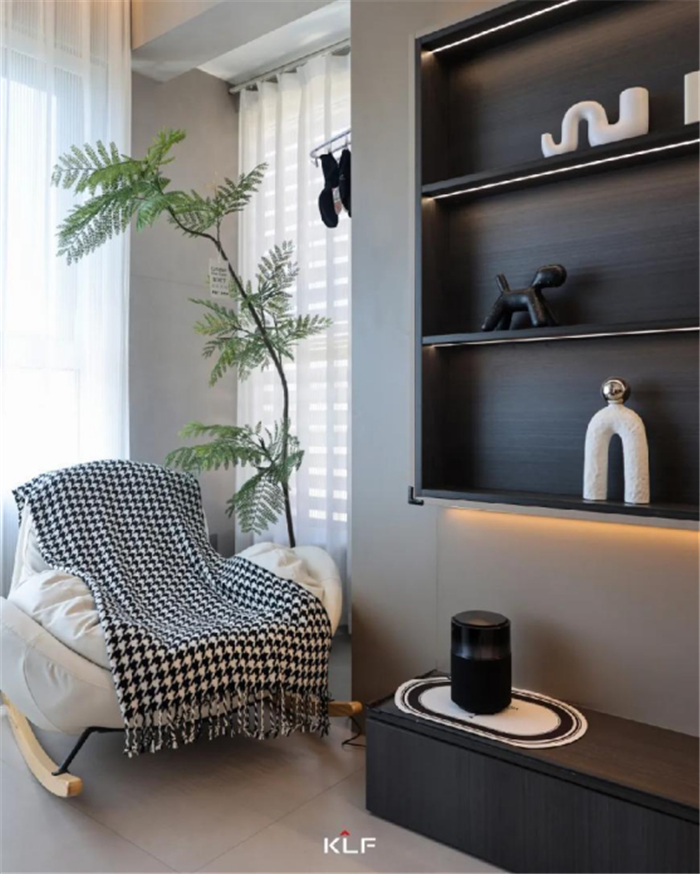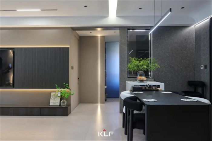 簡(jiǎn)約線條勾勒天花,穩(wěn)重色塊占據(jù)墻地。素雅米白、深邃黑色與質(zhì)樸木色交融碰撞,樸實(shí)溫厚的氣息浸潤(rùn)空間。