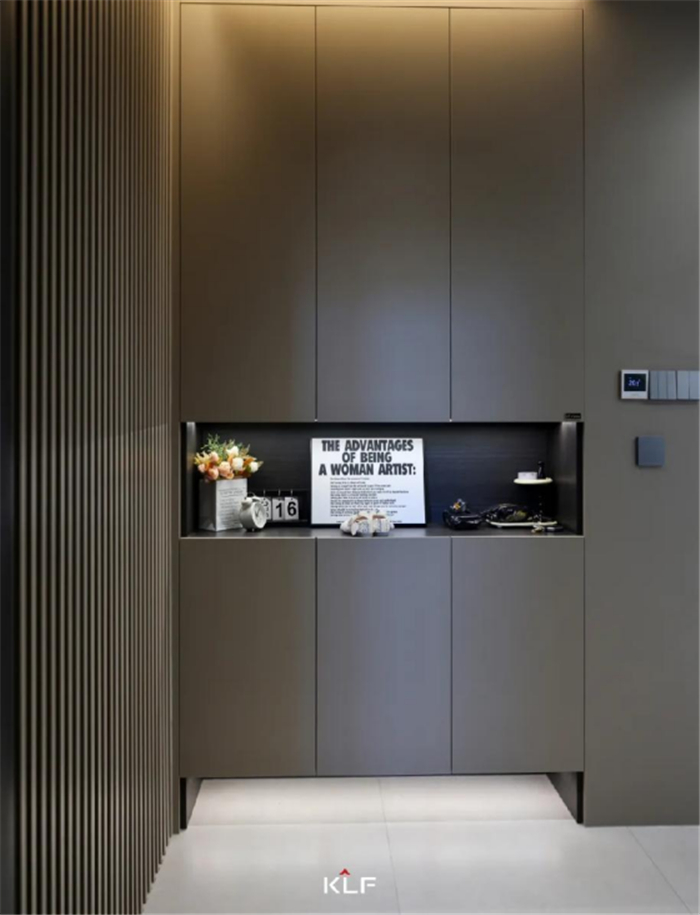 入戶玄關(guān),以內(nèi)斂精致的設(shè)計(jì)風(fēng)格,流露出新貴奢感,彰顯現(xiàn)代意式的平衡之美。靜謐的灰融化于玄關(guān)柜,啞光質(zhì)感低調(diào)奢華,黑胡桃木背板內(nèi)斂大氣,搭配線條感十足的木格柵,層次豐富的材質(zhì)拼接,流露出藝術(shù)氣息與都市風(fēng)尚。