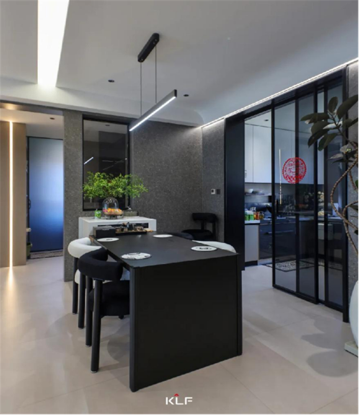 灰玻推拉門(mén)隔絕油煙,借玻璃通透特性自由連通,消弭了邊界感。材質(zhì)的細(xì)膩與其展示的簡(jiǎn)約形態(tài),自然地將功能擴(kuò)展、銜接,呈現(xiàn)出精致、純凈的生活儀式感。