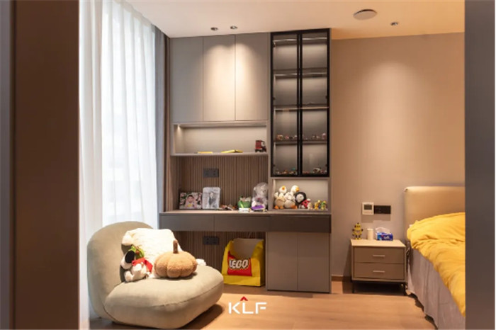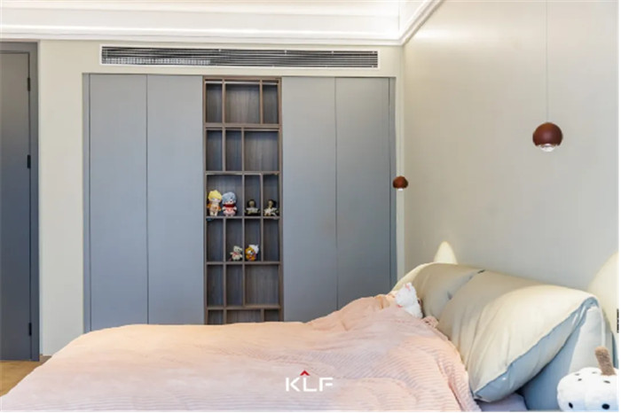 臥室設(shè)計(jì)中部不規(guī)則開放柜,放置日常玩偶、手辦、模型等收藏品,符合使用者所需,同時(shí)為衣柜增加了精致與顏值。