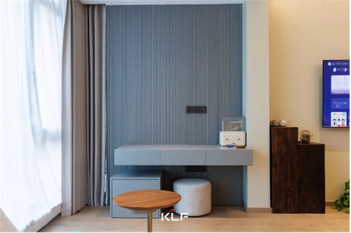 滿墻格柵設(shè)計(jì)增加舒適感,緩和輕奢風(fēng)帶來的疏離,讓空間更加和諧宜居,客廳無主燈設(shè)計(jì)讓空間更加寬闊明亮。