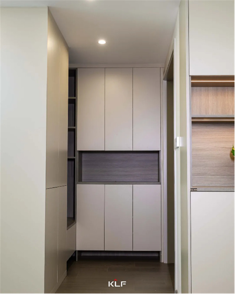 入戶的玄關(guān)走廊處做上了到頂?shù)男瘢竦牡撞苛艨占由喜毓?,在鞋柜當中還留了開放儲物區(qū)域,平時使用非常方便。