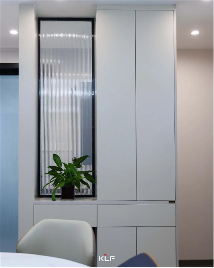 在餐廳與衛(wèi)生間的區(qū)域間以一組隔斷柜去進行空間美化,穿插的設(shè)計手法以抽屜分隔整個高柜,整體尺寸更加協(xié)調(diào),中部加入長虹玻璃的設(shè)計可以搭配綠植或是手辦擺件,整體會更精致。