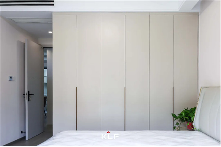 主臥室作為屋主的休息區(qū),整體更強調(diào)收納性和舒適度,采用茶白的色彩與全屋白色系更適配,一門到頂?shù)恼乓鹿癫捎玫氖且蛔中屯w拉手,方便使用。
