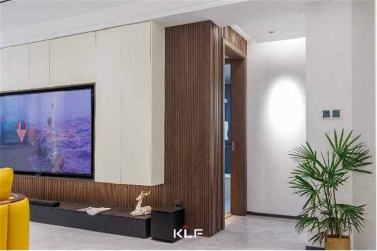 細(xì)格柵的造型墻板為墻面增加了立體感,一字型深灰色地柜直接落地,內(nèi)嵌3D霧化暖爐,帶給家更多溫馨。