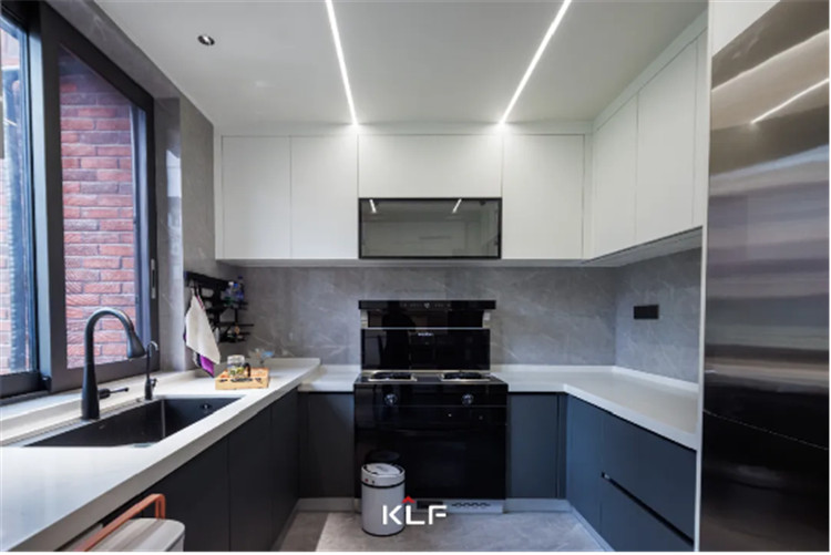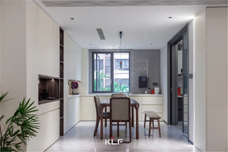 餐廚空間的設(shè)計風(fēng)格與起居空間保持一致,除了傳統(tǒng)的U型封閉式中廚外,在用餐區(qū)還做了高定全屋圍合的設(shè)計。