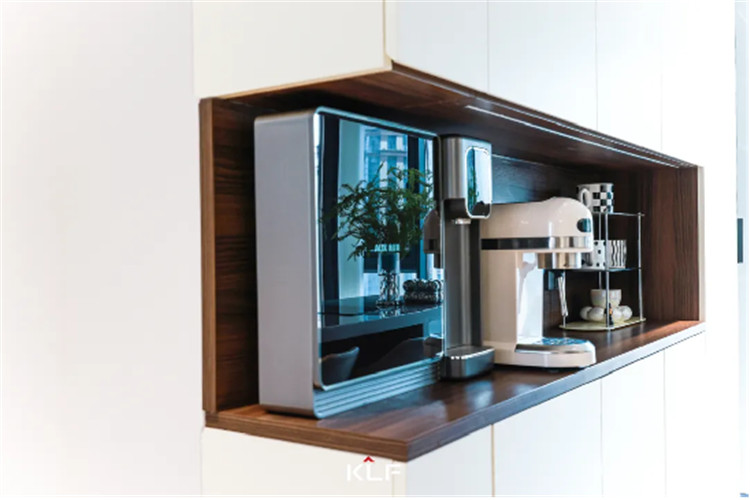 一側到頂餐邊柜結合開放格造型,以芬蘭白+煙熏橡木打造溫馨空間。定制柜體能夠隱藏好所有電線的同時可以根據(jù)家電預留置物區(qū)域,適合注重生活品質的家人。