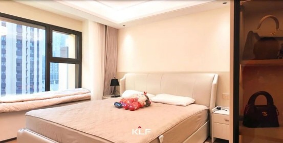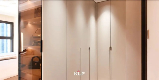 臥室以L形的轉角柜做收納和隔斷,合理劃分生活區(qū)域,一半是睡眠的床鋪區(qū)域,一半是步入式衣帽間,提升居住體驗。玻璃柜門以展示型收納美學為核心,融合功能與藝術的雙重屬性,成為高品位生活的具象化表達。
