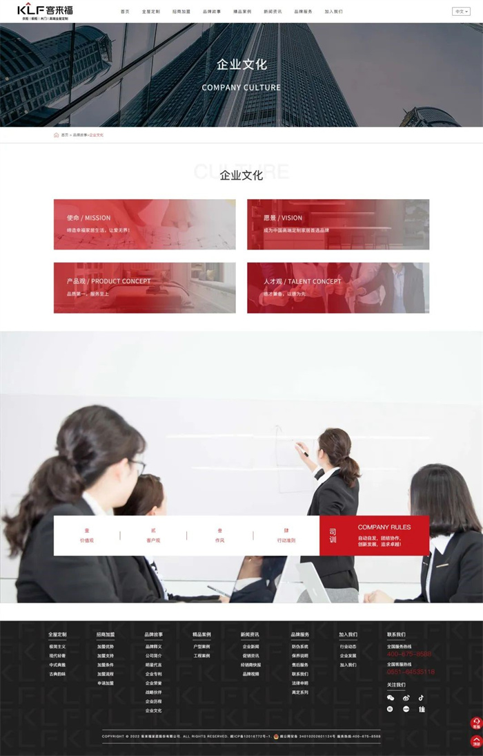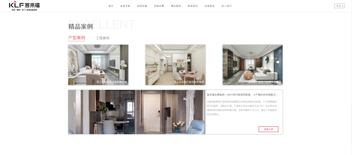 官網(wǎng)內(nèi)容定位上我們也進(jìn)行了進(jìn)一步明確,以“全屋定制、招商加盟、品牌故事、精品案例、新聞資訊、品牌服務(wù)、加入我們”七大版塊為主,分類清晰,排版主次分明。整體圖文并茂、便捷明了,讓用戶一鍵點擊,即可第一時間直觀了解到關(guān)于客來福最新的品牌信息。