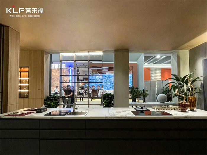 將客廳與開(kāi)放式廚房打造成整體空間是升級(jí)的亮點(diǎn)之一,PET的工藝幫助我們實(shí)現(xiàn)嵌入式的內(nèi)置功能,比如衛(wèi)生間的燈光和冰箱。除此之外,整家定制也是客來(lái)福今年的著力點(diǎn),多功能的產(chǎn)品柜和開(kāi)放式的設(shè)計(jì)模糊了空間界限。根據(jù)消費(fèi)者對(duì)于一站式一體化的消費(fèi)需求提供了解決方案。