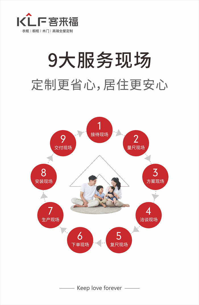 此外,客來福還以接待,量尺,方案,洽談,復(fù)尺,下單,生產(chǎn),安裝,交付九大服務(wù)現(xiàn)場保障廣大客戶的“幸福”生活。