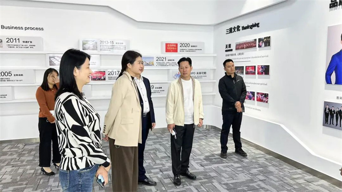 在尹董的帶領(lǐng)下,來(lái)訪的領(lǐng)導(dǎo)們來(lái)到客來(lái)福展廳的黨建文化處??蛠?lái)福家居以“幸?!睘楹诵闹贫ㄎ幕V領(lǐng),積極完善各項(xiàng)設(shè)施、建立健全工作機(jī)制,一直以來(lái)推動(dòng)黨建工作與企業(yè)發(fā)展融合互促,協(xié)同進(jìn)步。