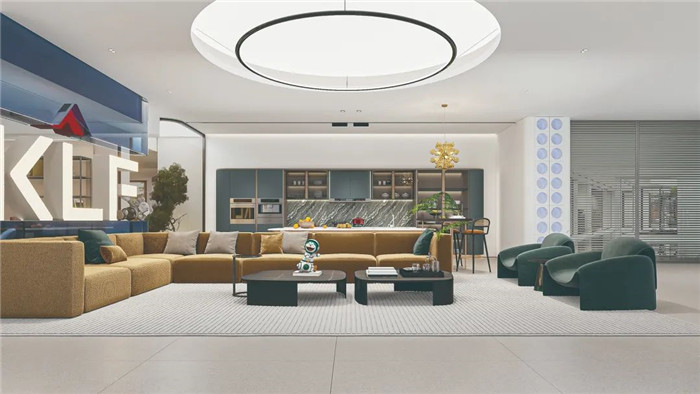 客廳采用藍(lán)色亞克力漸變?cè)O(shè)計(jì),同時(shí)做了品牌Logo的結(jié)合,既作為隔斷之用,也承載著品牌IP和視覺的傳達(dá)。