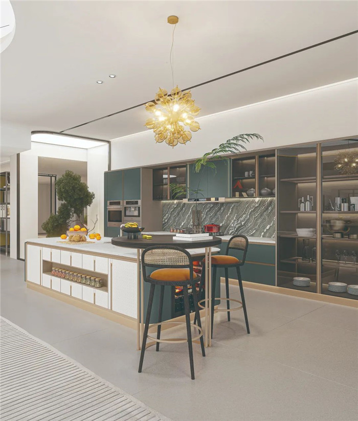 作為社交型廚房的核心區(qū)域——島臺(tái)的設(shè)置,既滿足了日常的備餐功能,也是對(duì)社交功能的拓寬。從烹飪場(chǎng)所升級(jí)到社交場(chǎng)所,空間的連接,亦是情感的橋梁,升華家的溫度,豐盈家的想象。