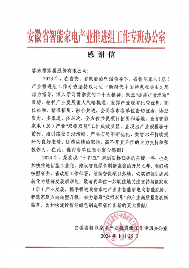 安徽省智能家電產(chǎn)業(yè)鏈推進(jìn)組工作專班辦公室感謝客來福家居助力智能家電(居)產(chǎn)業(yè)發(fā)展