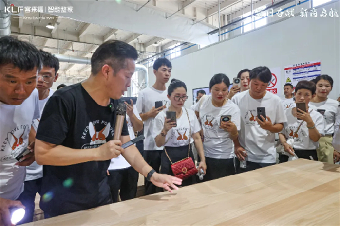 首站,大家來(lái)到了華東新橋生產(chǎn)基地。客來(lái)福董事長(zhǎng)尹其宏先生指引參觀路線,帶領(lǐng)大家充分了解各車(chē)間生產(chǎn)狀況。期間,他熱情介紹了新橋智能家居產(chǎn)業(yè)園完善的生產(chǎn)流程以及硬核裝備,如最新引入的德國(guó)進(jìn)口激光封邊機(jī)、木門(mén)自動(dòng)生產(chǎn)線等,收獲經(jīng)銷(xiāo)商伙伴的一致好評(píng)。
