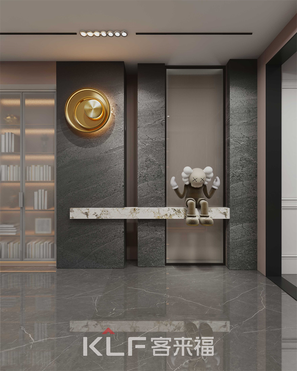入戶空間造景區(qū)與鞋柜相互呼應(yīng),精致的長虹玻璃作為情緒與視覺的點睛,填充空間空白的同時,也衍生出生活美學的設(shè)計感與儀式感。
