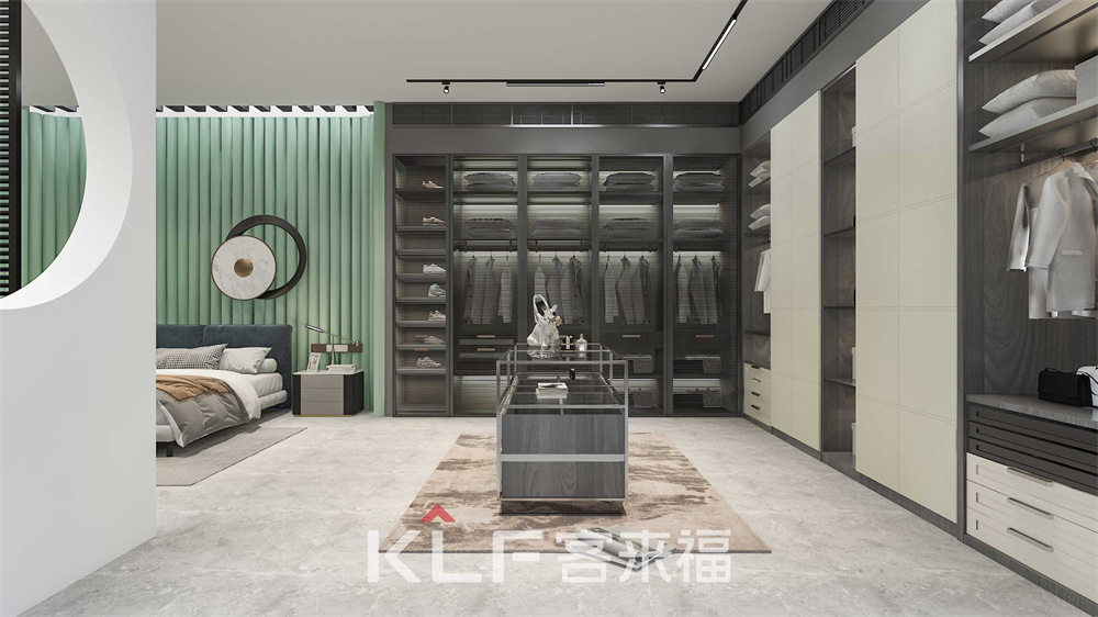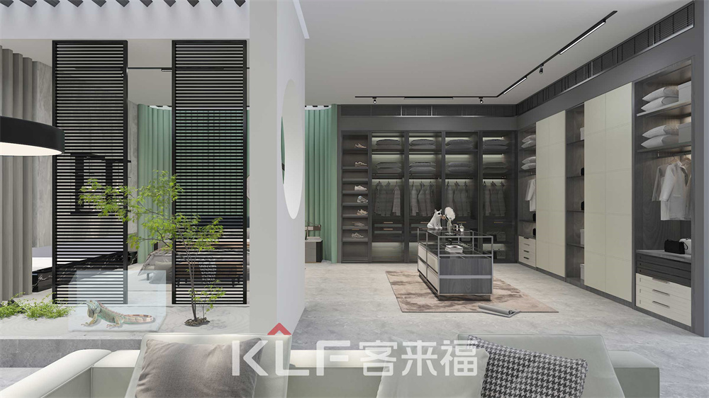 柵欄式背景設計塑造空間的線條感,灰色磚紋背景色的搭配加上具有藝術感的掛件,放大了空間的視覺效果。L型的衣帽間安排,衣帽間皮紋門板的運用低調奢華。采用阻尼軌道,在抽拉時光滑不受阻,給拉開抽屜時順滑的享受。