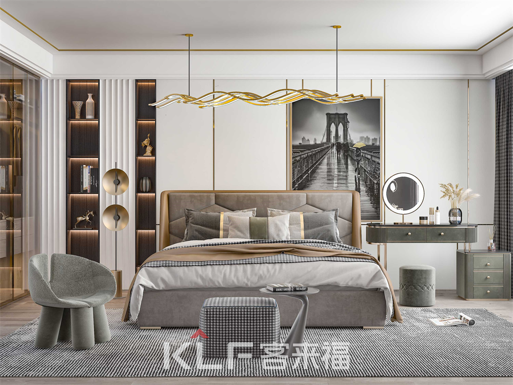 臥室采用不同于客廳書房的溫馨色調(diào),反而采用的現(xiàn)代金屬風(fēng)讓并無太多家居搭配的臥室,能夠?qū)⒑?jiǎn)約與奢華共聚一身,且相處融洽。