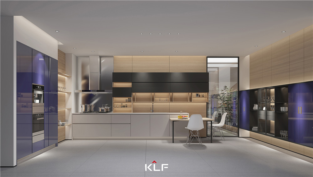 廚房以U型設(shè)計呈現(xiàn),豐富的收納空間還原了日常干凈整潔的居家環(huán)境;科技橡木搭配魔力黑、紫棠色也更儒雅,地柜空間采用茶白,視覺上更顯清爽;廚房在收納抽屜上運用了新款的上翻電動靈云展、電動上翻折疊門等科技。