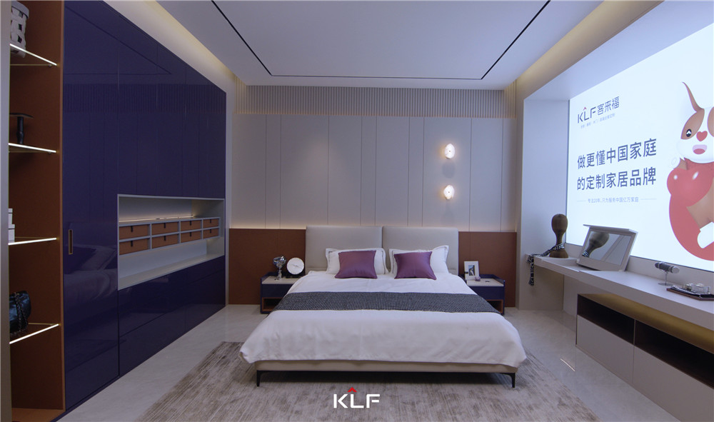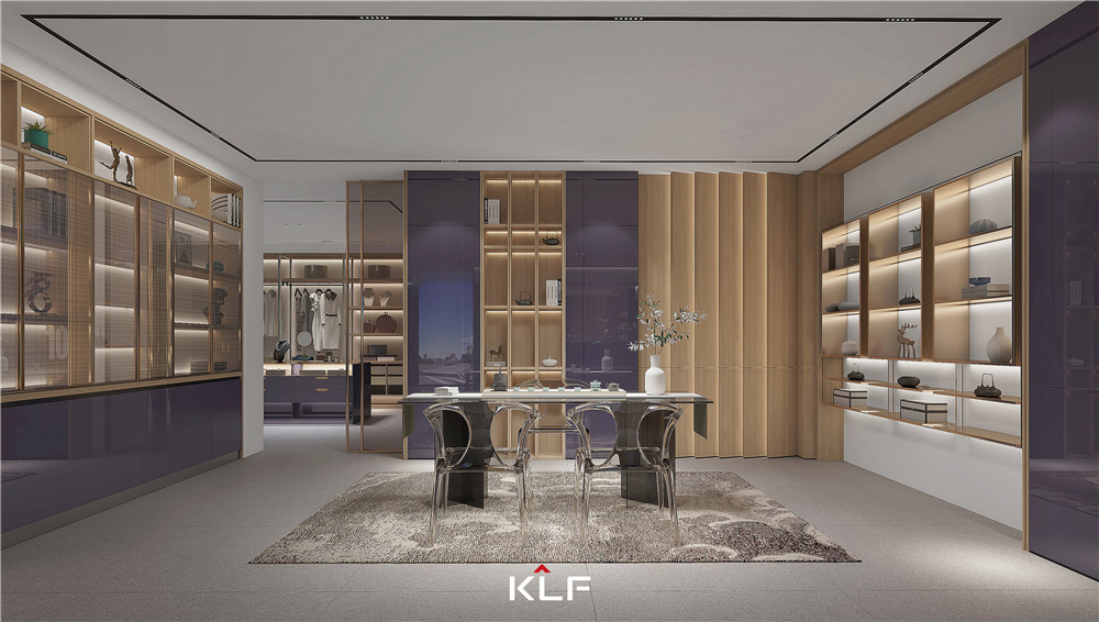 客廳采用圍合式布局,一側(cè)墻壁做鏡面處理,與柜體進(jìn)行模塊化組合;矩陣成型的柜體紫棠色映入眼簾,活潑且高級;烤漆門板順滑且頗賦光澤感,展現(xiàn)出客來福的創(chuàng)意工藝。