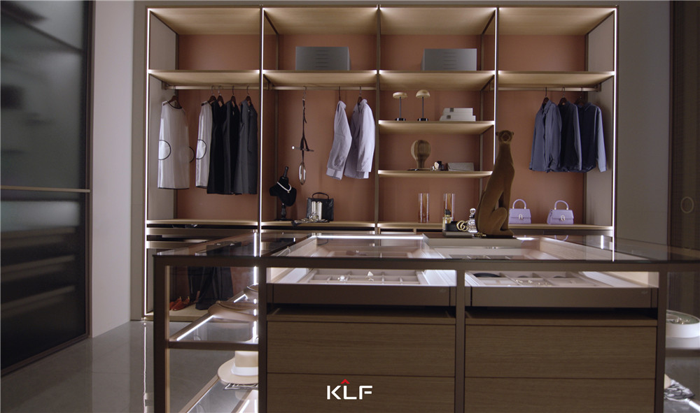 衣帽間采用金屬霧銀色框架+馬爾斯玻璃+石青綠的高光背板,打造定制款的高端家居;鋁木結(jié)合的開放式到頂衣柜通過法老金搭配科技橡木層板,提高空間利用率。