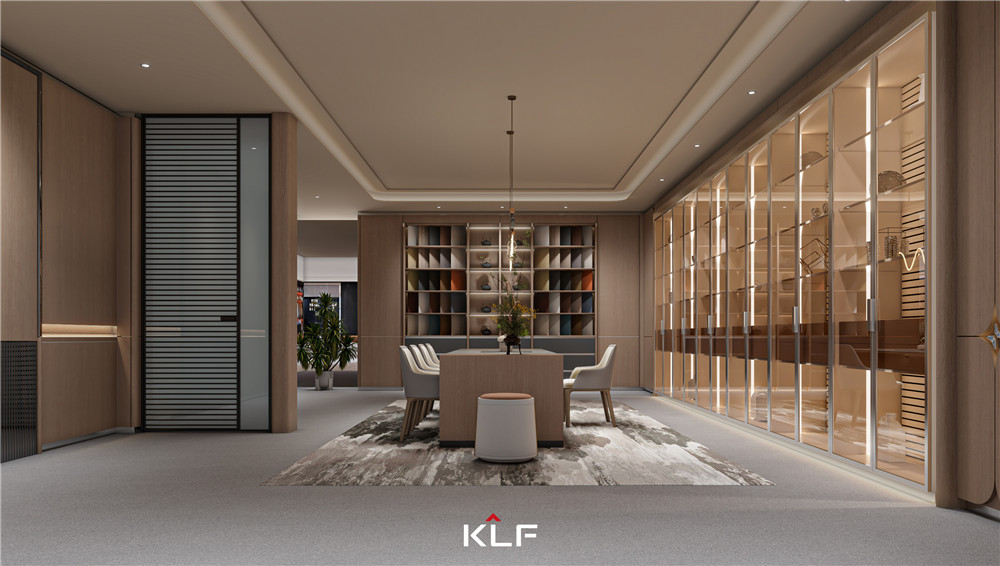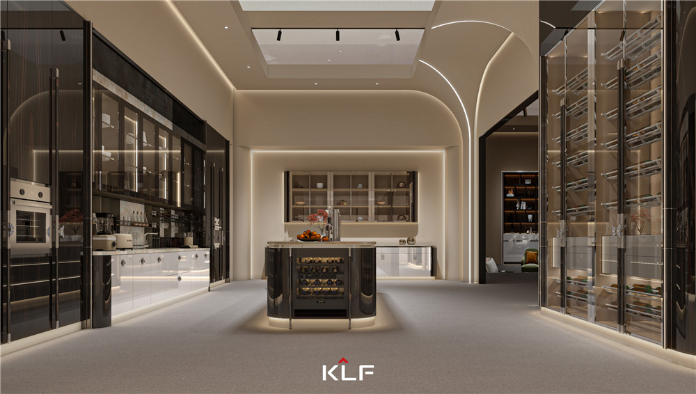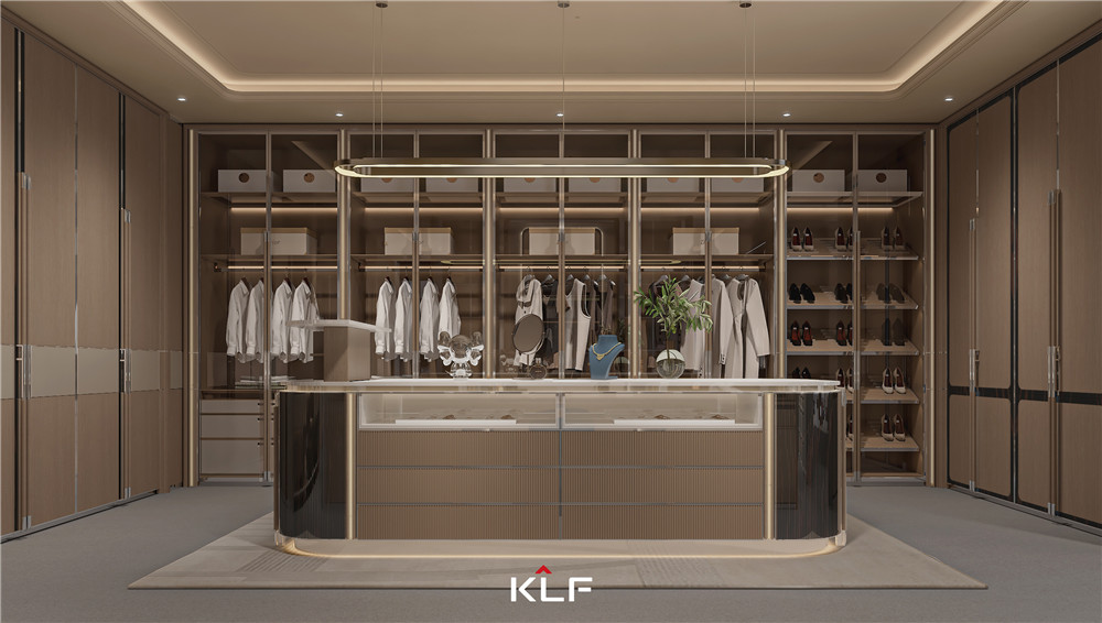 顏色上以白橡小山木紋搭配玻璃來呈現(xiàn)出輕奢,氛圍燈光渲染出柔暈光線,增加層次感;獨特的“F”品牌標(biāo)簽拉手,寓意“?!?;掛衣桿以KLF中的“K”為靈感,打造了一個具有品牌辨識度的蝴蝶掛衣桿。
