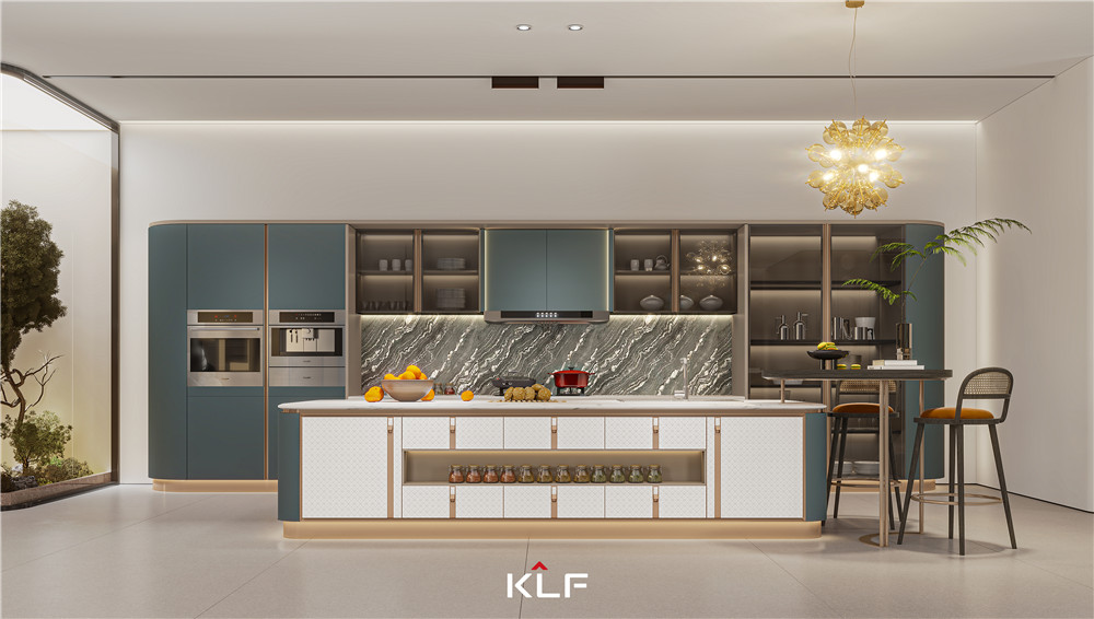 圓弧元素貫穿空間,線條顯溫柔之美。整面定制櫥柜以鳶尾藍為主色調(diào),羅馬柱、嵌入燈光的運用,勾勒出高級奢感;島臺整體呈橢圓形,島臺柜門采用客來福IP皮革雕刻工藝,顏值在線;珊瑚白柜門與魚肚白臺面相呼應(yīng),顏色更具層次感。