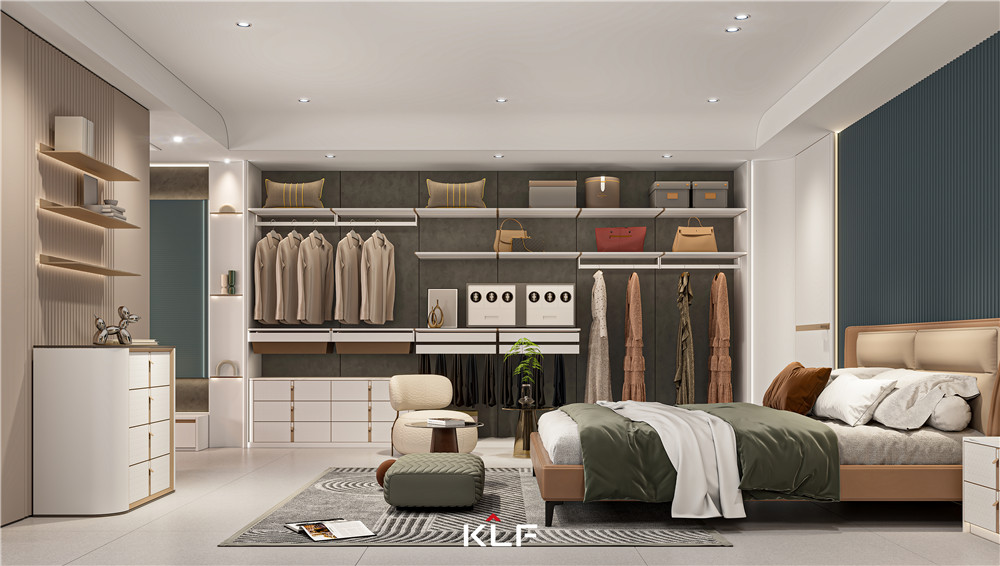 臥室背景板應(yīng)用了極光白的S弧形護墻板+菱形格+圓弧波浪板,凹凸有致,以光影感成就空間藝術(shù)感;床頭柜沿用IP雕刻門板+兩側(cè)圓弧設(shè)計,讓小床頭柜也頗具特色;衣柜采用懸掛系統(tǒng),整體敞開式布局增強空間通透感。
