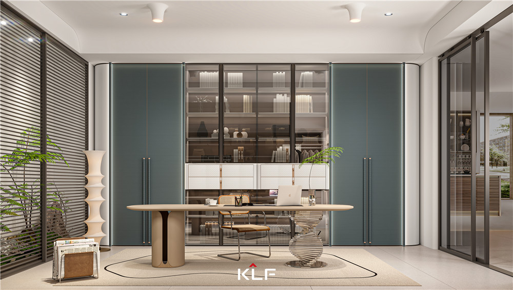 書房兩側(cè)帶燈裝飾柱+極光白圓弧墻板,以侘寂奢感展現(xiàn)空間韻味,門板上的特色拉手讓人驚艷。